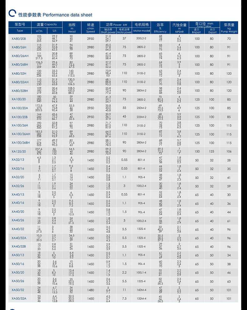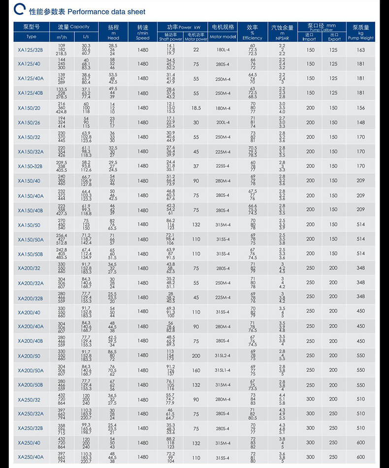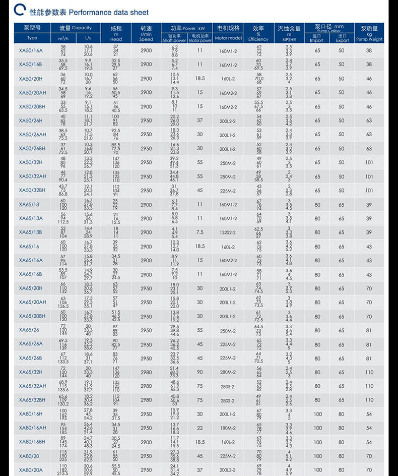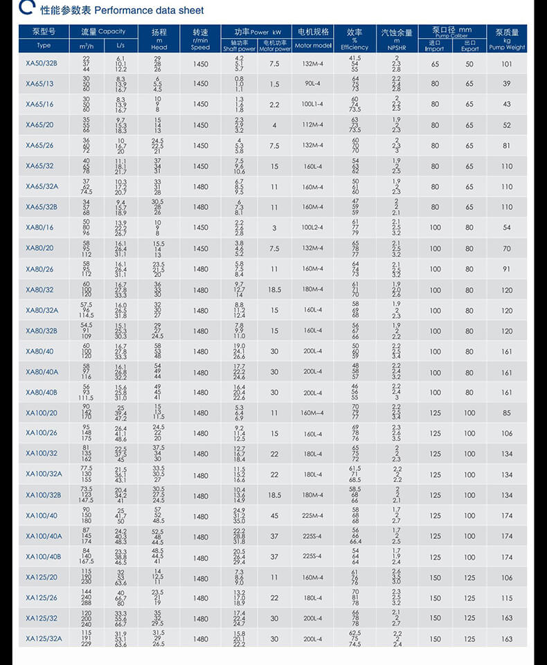 XA系列泵為單級(jí)單吸離心泵。該泵主要由泵體、泵蓋、葉輪、軸、軸套和懸架等部分組成。泵軸伸出端由兩個(gè)滾動(dòng)軸承支承,軸承用機(jī)器油或潤(rùn)滑脂潤(rùn)滑。填料函用軟填料或機(jī)械密封。泵通過(guò)彈性聯(lián)軸器由電動(dòng)機(jī)直接驅(qū)動(dòng)。