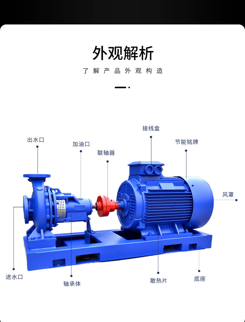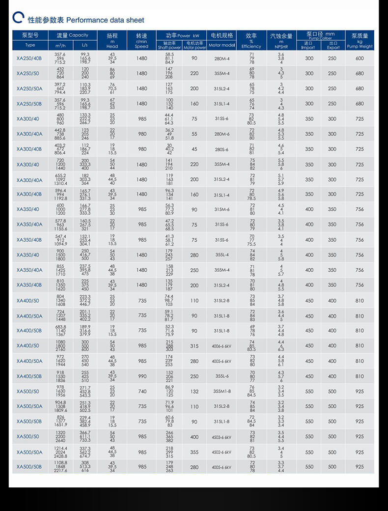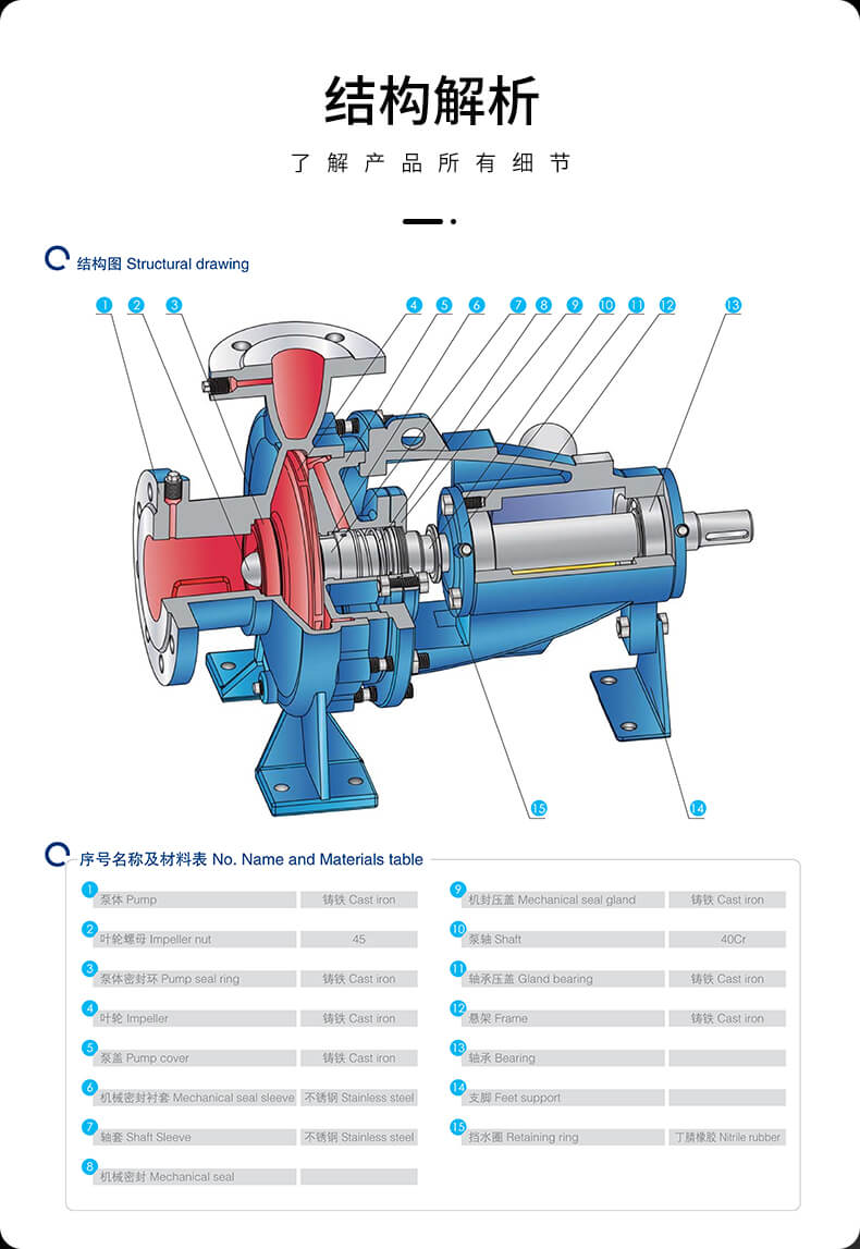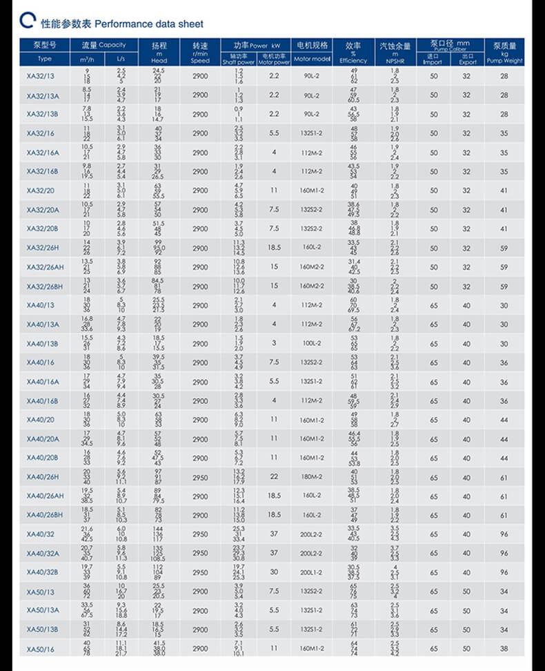 XA系列泵為單級(jí)單吸離心泵。該泵主要由泵體、泵蓋、葉輪、軸、軸套和懸架等部分組成。泵軸伸出端由兩個(gè)滾動(dòng)軸承支承,軸承用機(jī)器油或潤(rùn)滑脂潤(rùn)滑。填料函用軟填料或機(jī)械密封。泵通過(guò)彈性聯(lián)軸器由電動(dòng)機(jī)直接驅(qū)動(dòng)。