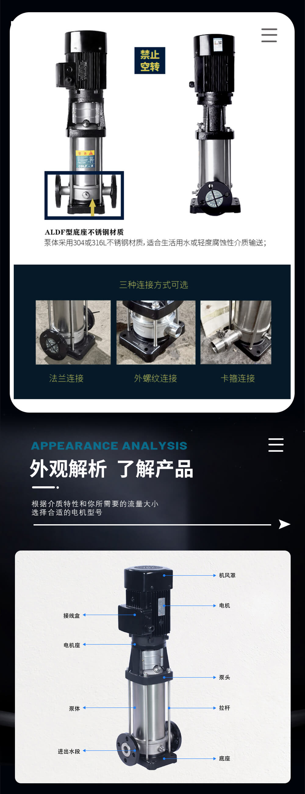 ALDF系列輕型不銹鋼立式多級離心泵是吸取了國內外先進技術而設計制造的非自吸立式多級離心泵,采用標準立式電機和快裝式機械密封,更換非常方便。泵的過流部分均采用不銹鋼(304\316)材料制成,可適用于輕度腐蝕性介質。該產(chǎn)品可替代國外CR、CRN等同類產(chǎn)品。產(chǎn)品投放市場后,以其高效節(jié)能、質量可靠、使用范圍廣等特點,深受廣大用戶的喜愛。