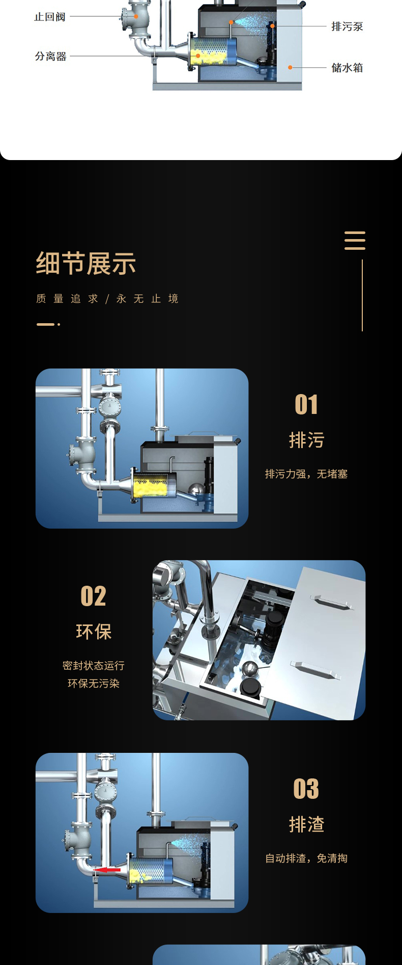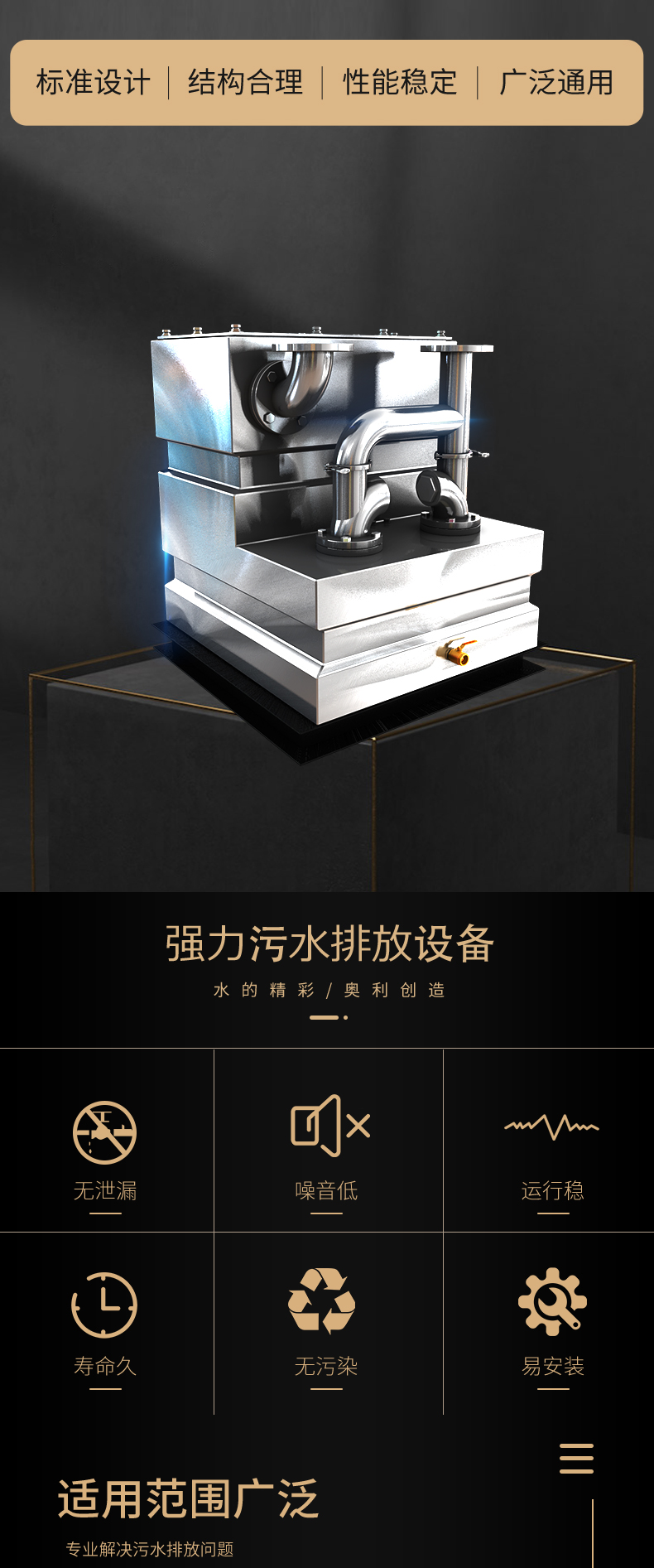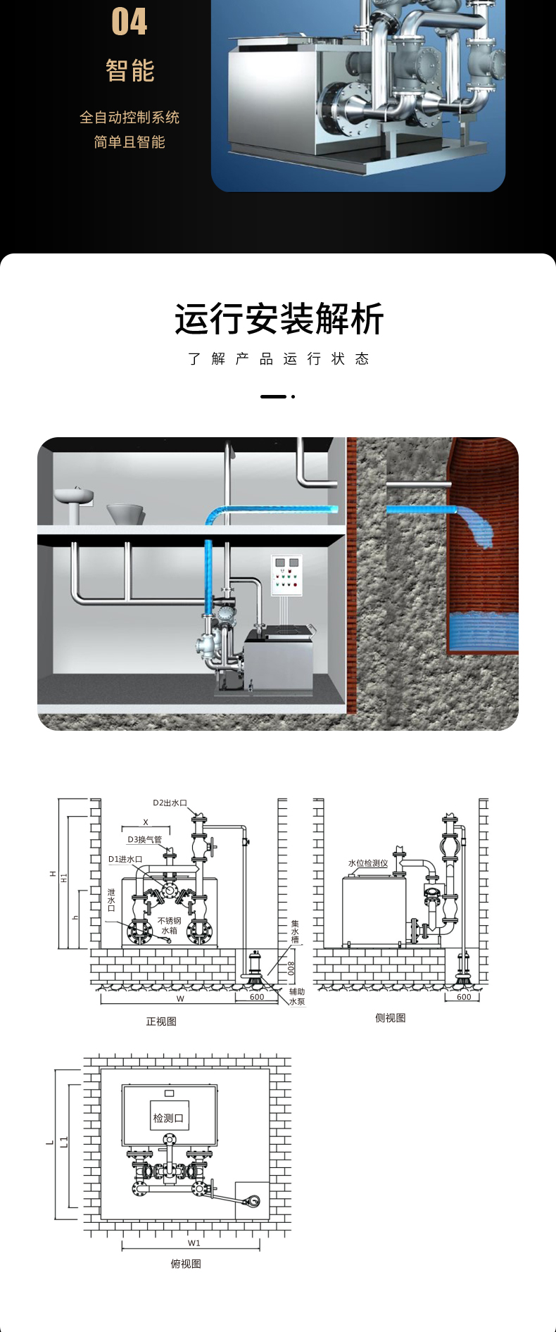 ALPW型污水強(qiáng)力排放設(shè)備,是我公司技術(shù)研發(fā)人員結(jié)合現(xiàn)場實(shí)際使用情況,以經(jīng)濟(jì)實(shí)用、環(huán)保高效為核心自主開發(fā)的新一代產(chǎn)品。它的特點(diǎn)是利用設(shè)備過濾功能將污水中的雜質(zhì)和固體顆粒巧妙的擋在雜質(zhì)沉積腔里,當(dāng)集水箱內(nèi)水位達(dá)到設(shè)定啟泵水位時(shí),污水泵啟動將箱內(nèi)集水與沉積腔內(nèi)的雜質(zhì)一起排至室外排水檢查井里,當(dāng)集水箱內(nèi)水位達(dá)到停泵水位時(shí),污水泵停止完成了一次污水排放,每排放一次,就對沉積腔內(nèi)的雜質(zhì)清理一次,既避免了雜物的沉積節(jié)省了人工定時(shí)清理;又使雜質(zhì)不通過污水泵,避免水泵卡死造成的損壞。