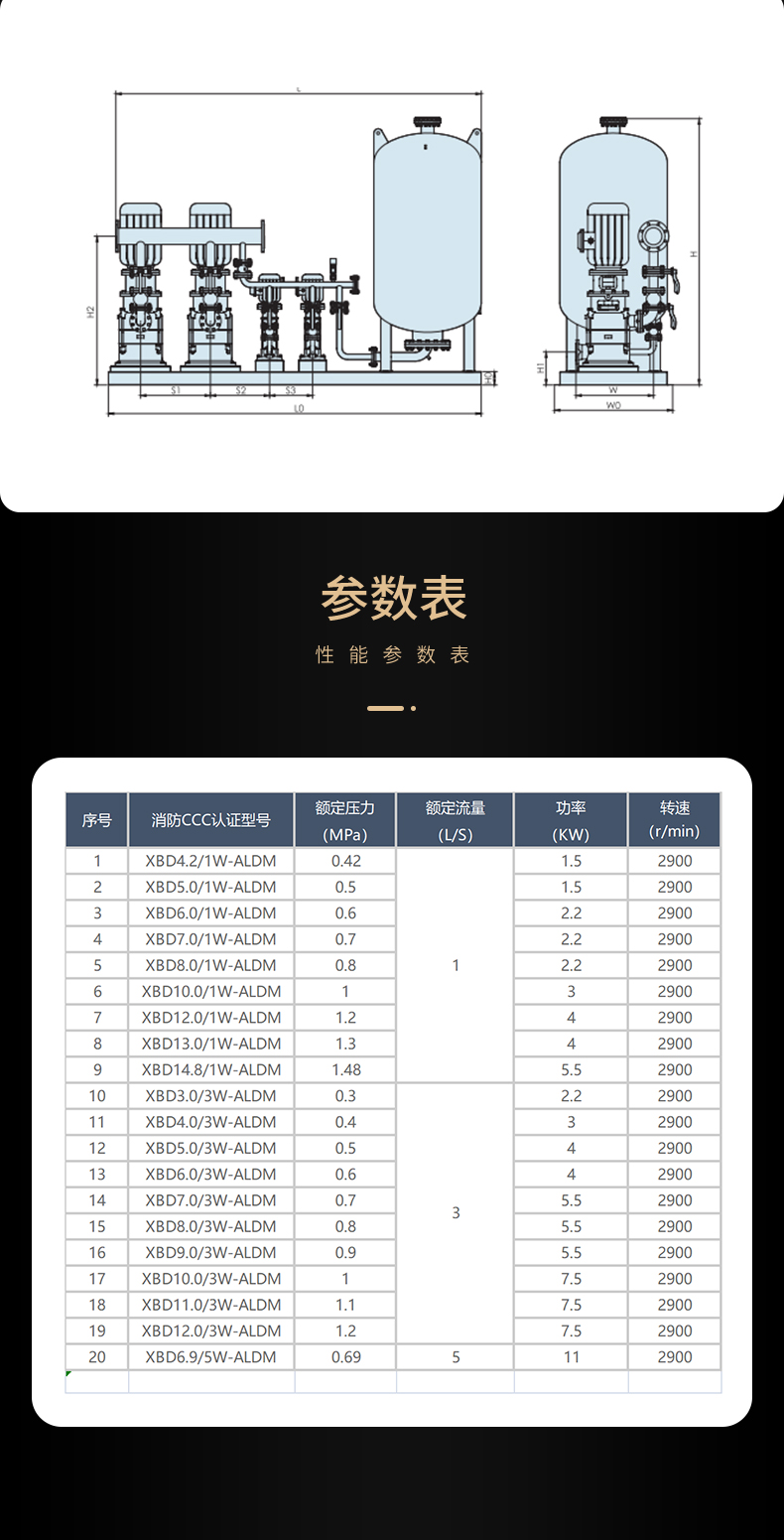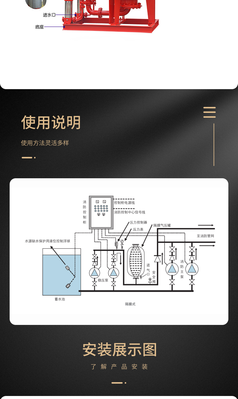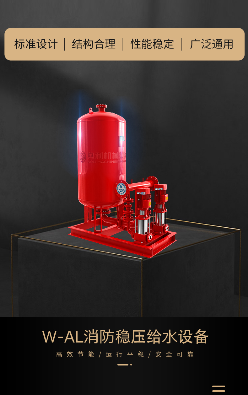 W-AL消防穩(wěn)壓給水設備是利用食品級橡膠作為氣水隔離的新型設備,一次充氣,常年運行使用。通過電接點壓力表和電控箱控制水泵運行,達到額定的壓力和連續(xù)供水。是按照國家消防設計規(guī)范GB50016《建筑設計防火規(guī)范》及國家標準 GB27898.3《固定消防給水設備第四部分∶ 消防增壓穩(wěn)壓給水設備》設計、制造的消防專用的增壓穩(wěn)壓設備。該設備由隔膜式氣壓罐、增壓泵、電控箱、儀表和管路附件等組成,適用于多層和高層建筑工程有增壓要求的消火栓給水系統(tǒng)及自動噴水滅火系統(tǒng)等各類消防給水系統(tǒng)。