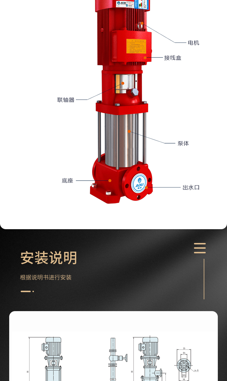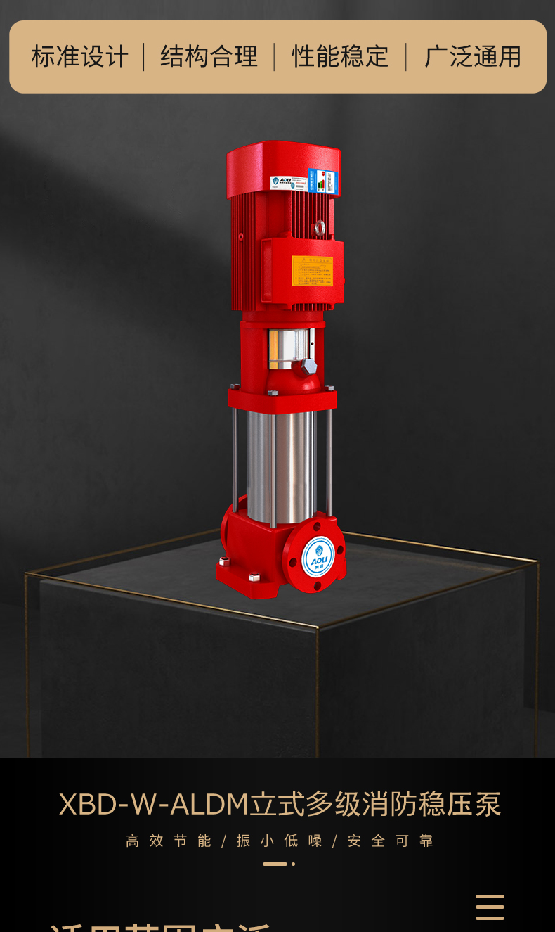 XBD-ALDM立式多級消防穩(wěn)壓泵,是在原有的ALDM立式多級泵的基礎(chǔ)上根據(jù)GB6245《消防泵》國家強制性標準要求進行開發(fā)出的新一代中低壓消防穩(wěn)壓泵組產(chǎn)品。XBD-ALDM多級消防穩(wěn)壓泵在性能、結(jié)構(gòu)、材料和配套上均滿足GB6245 《消防泵》國家強制性標準的要求。由于采用優(yōu)秀的水力模型,因此該系列泵具有滿足用戶要求;采用立式泵結(jié)構(gòu),具有效率高、性能范圍廣的特點,可更好的節(jié)省占地面積的優(yōu)點;采用優(yōu)質(zhì)軸承和優(yōu)質(zhì)電機,使泵運行更為安全可靠、噪音低、振動小;采用水力平衡軸向力,減少平衡鼓,可使運行更為平穩(wěn)。其