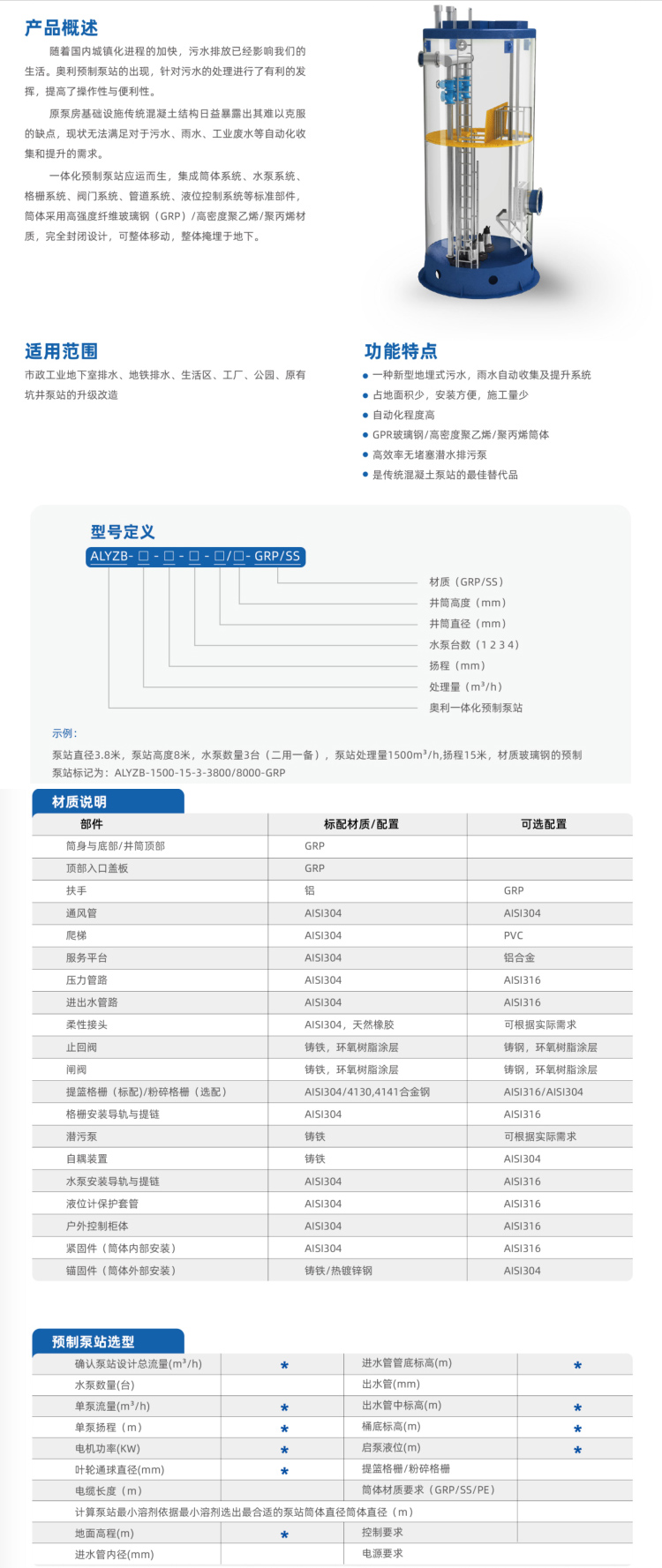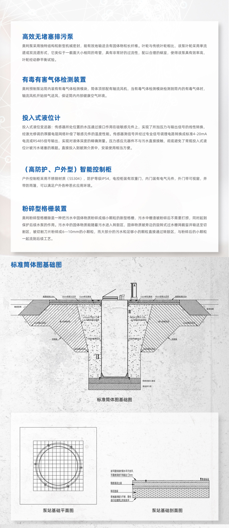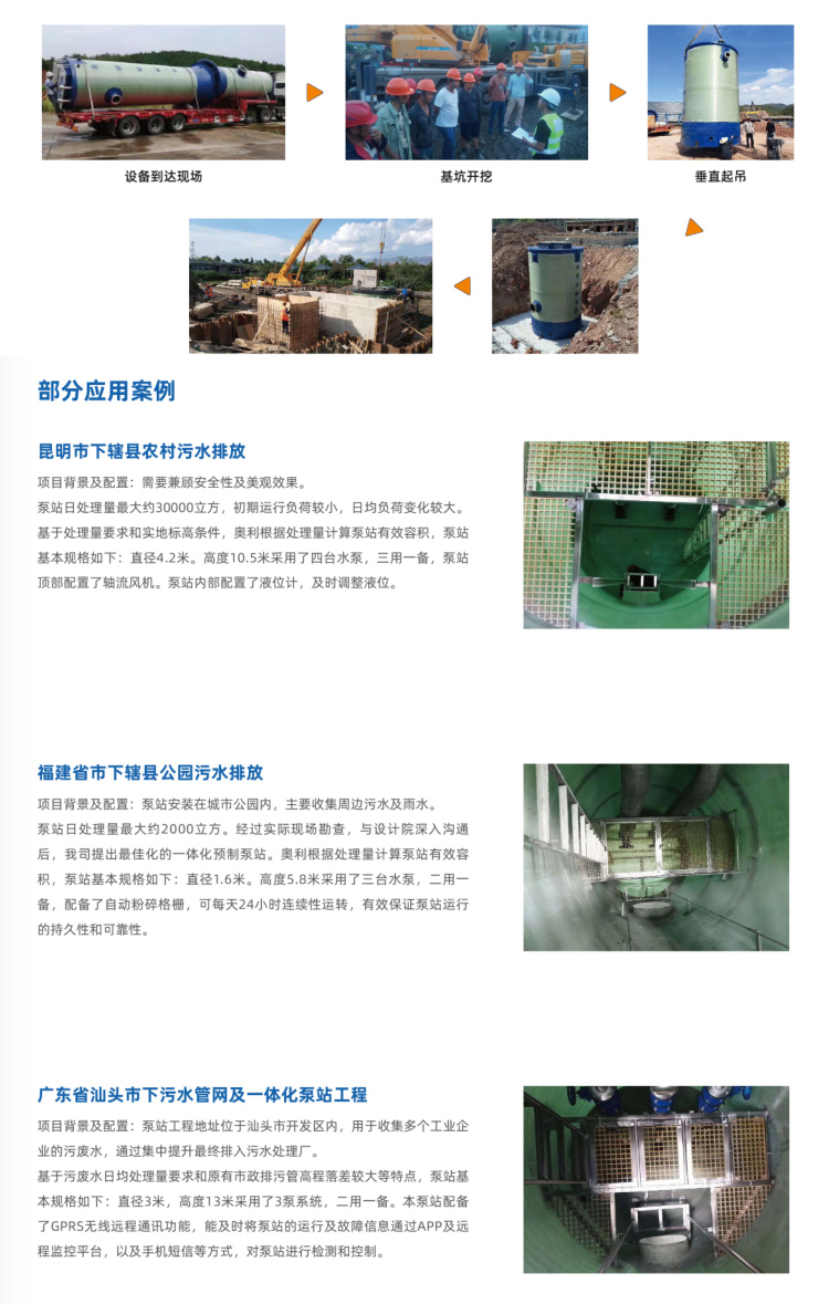 隨著國內(nèi)城鎮(zhèn)化進(jìn)程的加快,污水排放已經(jīng)影響我們的生活。奧利預(yù)制泵站的出現(xiàn),針對污水的處理進(jìn)行了有利的發(fā)揮,提高了操作性與便利性。原泵房基礎(chǔ)設(shè)施傳統(tǒng)混凝土結(jié)構(gòu)日益暴露出其難以克服的缺點(diǎn),現(xiàn)狀無法滿足對于污水、雨水、工業(yè)廢水等自動化收集和提升的需求。一體化預(yù)制泵站應(yīng)運(yùn)而生,集成筒體系統(tǒng)、水泵系統(tǒng)、格柵系統(tǒng)、閥門系統(tǒng)、管道系統(tǒng)、液位控制系統(tǒng)等標(biāo)準(zhǔn)部件,筒體采用高強(qiáng)度纖維玻璃鋼(GRP)/高密度聚乙烯/聚丙烯材質(zhì),完全封閉設(shè)計(jì),可整體移動,整體掩埋于地下。