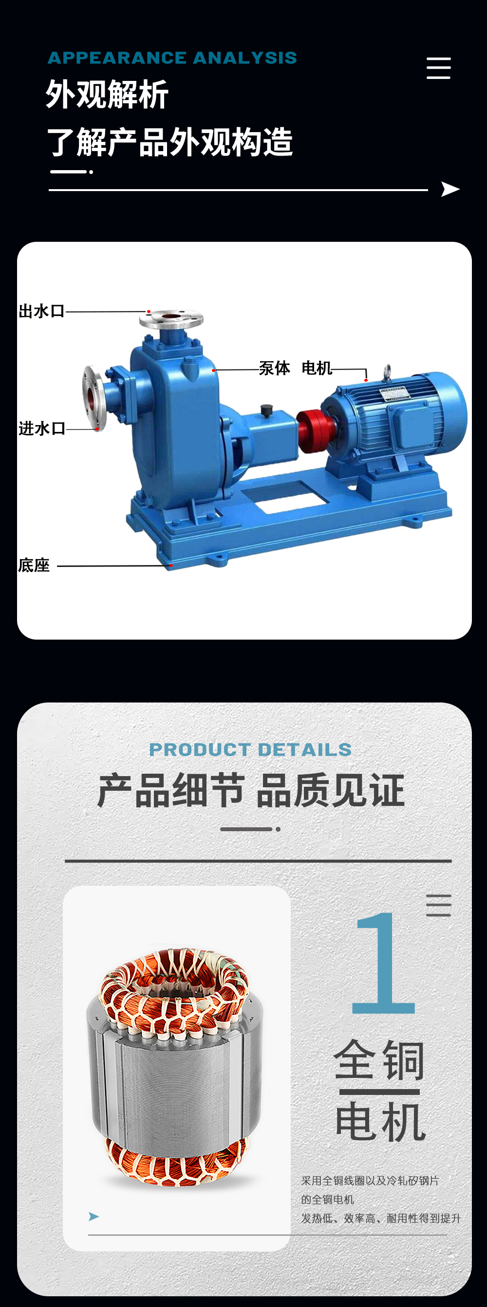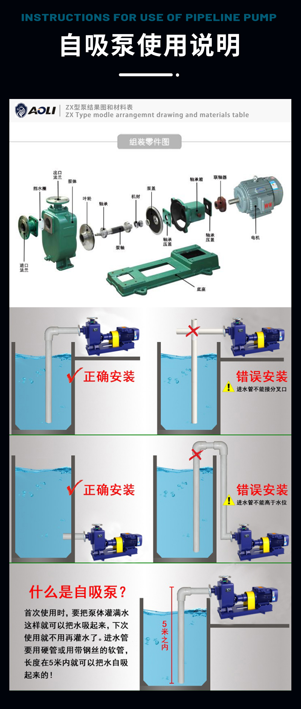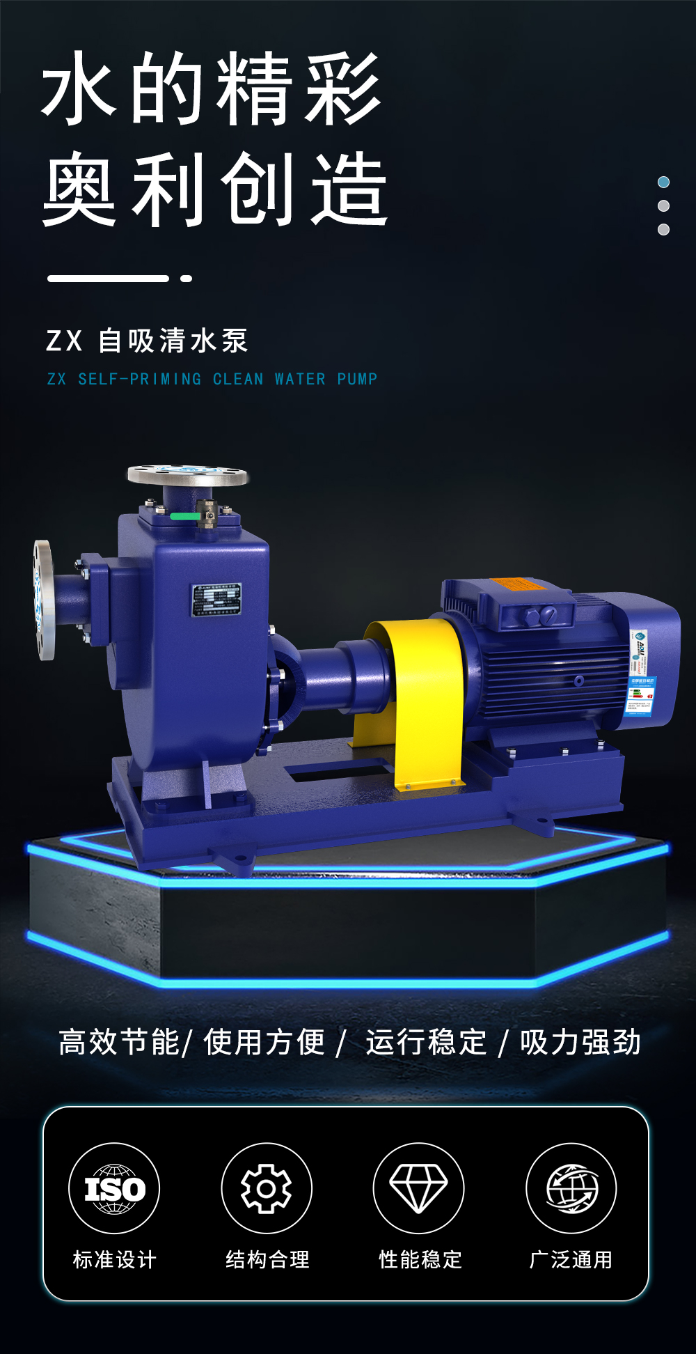 ZX系列型泵是臥式自吸泵。該型式泵 與其它型式的自吸離心泵比較,因?yàn)楸帽旧頉] 有逆止閥,結(jié)構(gòu)最為簡單;工作最為可靠;無 故障工作時間長,維護(hù)、使用方便、體積小、 重量輕、效率高、在設(shè)計(jì)上做了特別的考慮與 相同口徑的泵比較,排量大、性能高。在工農(nóng)業(yè)生產(chǎn)、搶險救助,如排澇、救火中作為應(yīng)急泵使用效能更為突出。 廣泛適用石 油、化工、冶金、機(jī)械、化纖、食品、能源、交通等工業(yè)部門城市給水、亦可用于農(nóng)業(yè)排灌、 噴灌。供輸送清水或粘度小于5°E,溫度低于80℃物理及化學(xué)性質(zhì)類似清水的其它液體。